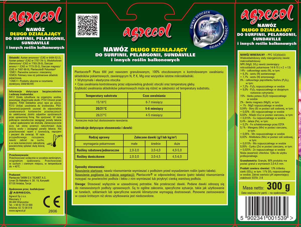 Plantacote® Pluss 6M nawóz do surfinii, pelargonii, sundaville i innych roślin balkonowych to granulowany nawóz długo działający. Każda granula nawozu zawiera odpowiednio dobrany skład makro- i mikroelementów niezbędnych do prawidłowego wzrostu i kwitnienia przez cały okres wegetacji. Otoczkowane granule zapobiegają wypłukiwaniu nawozu do głębszych warstw podłoża, niedostępnych dla korzeni roślin. W ten sposób więcej składników odżywczych jest wykorzystywanych przez rośliny (aż do 80-90%). Stosowanie nawozu otoczkowanego niweluje ryzyko przenawożenia, a przy tym chroni środowisko naturalne. Plantacote to kompletny, wieloskładnikowy nawóz o działaniu determinowanym przez czynniki środowiska, tj. wilgotność i temperaturę otoczenia. To najdłużej uwalniający składniki pokarmowe nawóz w ofercie Agrecol. Dzięki zastosowaniu specjalnej technologii otoczkowania zabieg nawożenia można wykonywać tylko raz w sezonie wegetacyjnym.